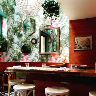 For similar walls try the Lara Costafreda - Jungle wallpaper £45, PaperMoon; The chairs used are probably the white Thonet bentwood chairs with natural timber socks. The mirror below is from Out There Interiors.